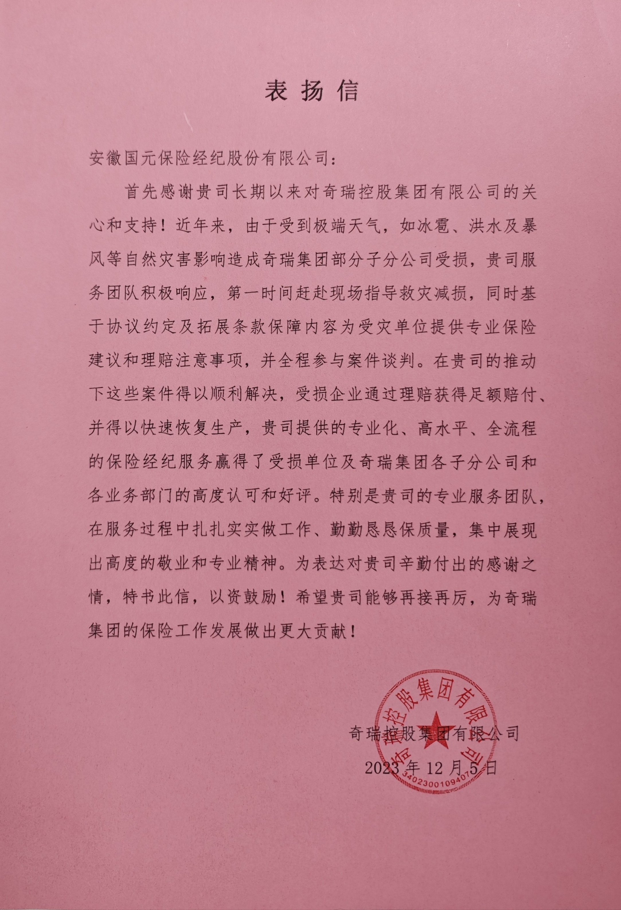 奇瑞集團(tuán)在表揚(yáng)信中特別提到,國元保險(xiǎn)經(jīng)紀(jì)在服務(wù)過程中扎實(shí)工作,勤勉盡責(zé),展現(xiàn)出高度的敬業(yè)和專業(yè)精神,贏得了受損單位、奇瑞集團(tuán)各子分公司及各業(yè)務(wù)部門的高度認(rèn)可和好評。